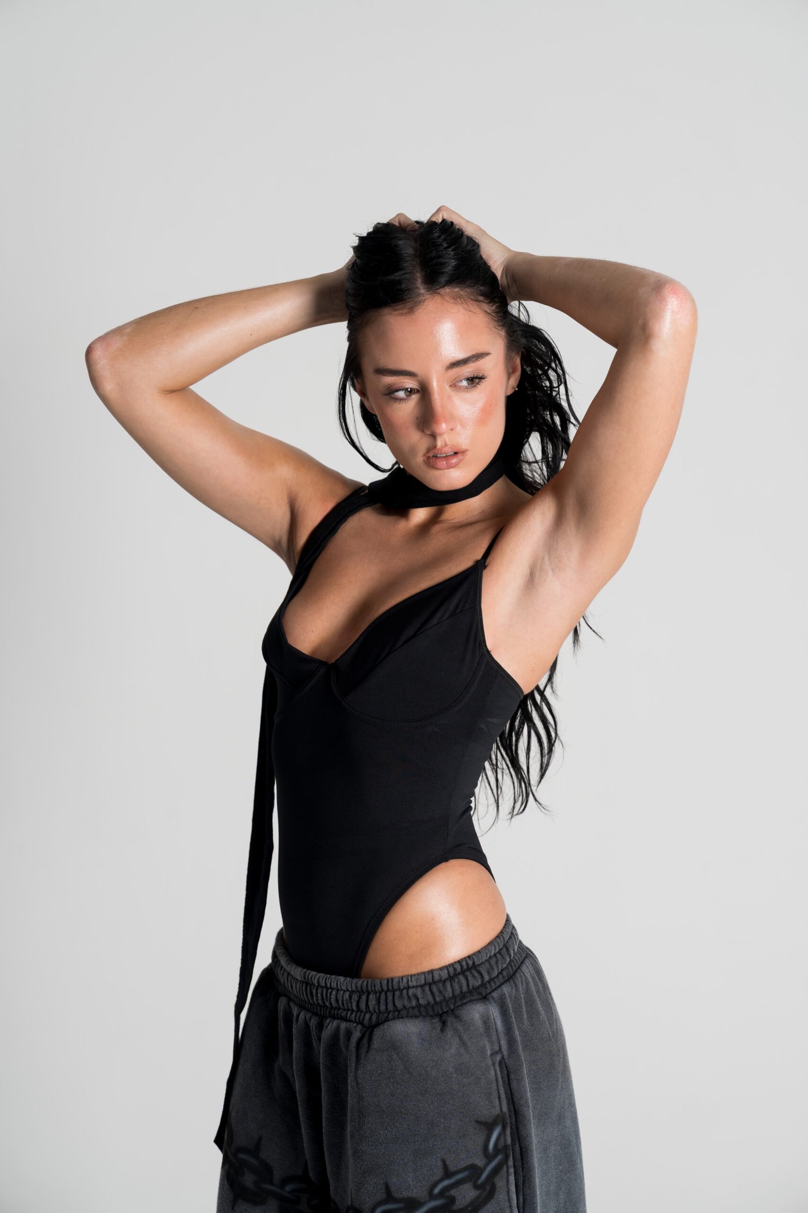 Body con aros, escote profundo y espalda baja. Fit al cuerpo, confeccionado en poliamida con elastano. Broches en la entrepierna.